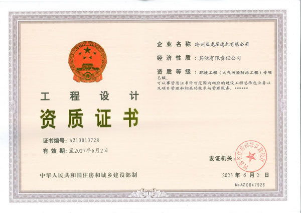 環(huán)境工程設(shè)計資質(zhì)證書-滄州亞龍壓濾機有限公司