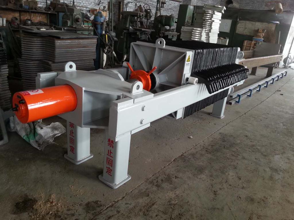 4.正常調(diào)試后的小型板框壓濾機(jī)可以投入使用,每班檢查整臺(tái)機(jī)器。機(jī)械壓力傳遞部件和減速箱應(yīng)充足潤滑油;液壓壓縮檢查油箱儲(chǔ)存量和液壓站工作壓力,液壓油一般每年更換一次。更換時(shí),應(yīng)好好清潔液壓系統(tǒng),液壓站的工作壓力應(yīng)小于液壓缸的大工作壓力,但小值不應(yīng)小于過濾壓力的允許值。